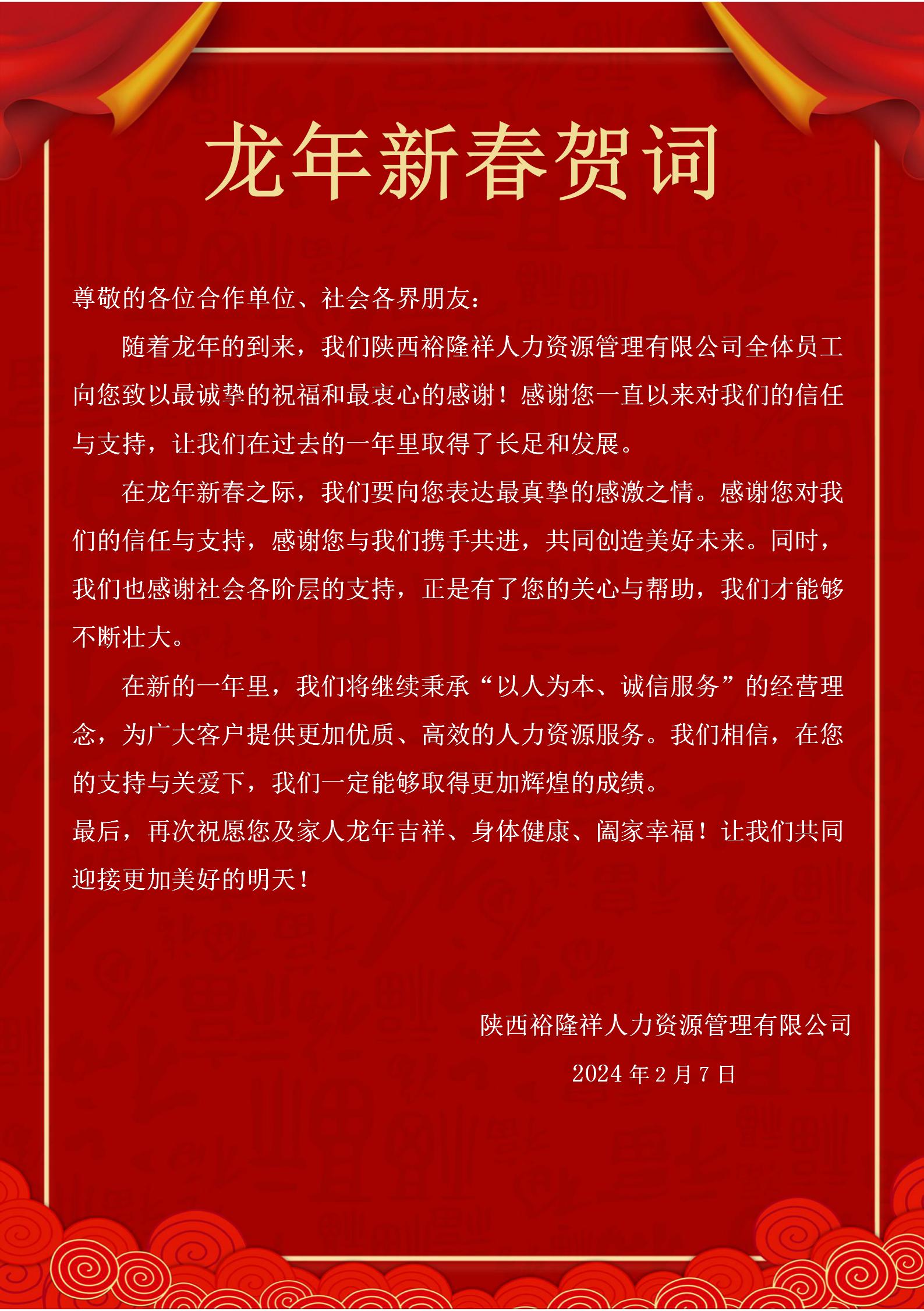 當(dāng)前位置: 陜西裕隆祥人力資源管理有限公司 > 企業(yè)文化 > 龍年賀詞