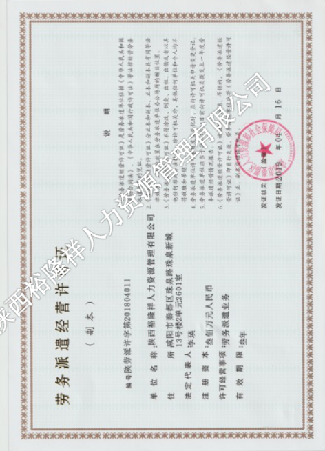 當前位置: 陜西裕隆祥人力資源管理有限公司 > 企業(yè)文化 > 榮譽資質 > 勞務派遣服務許可證