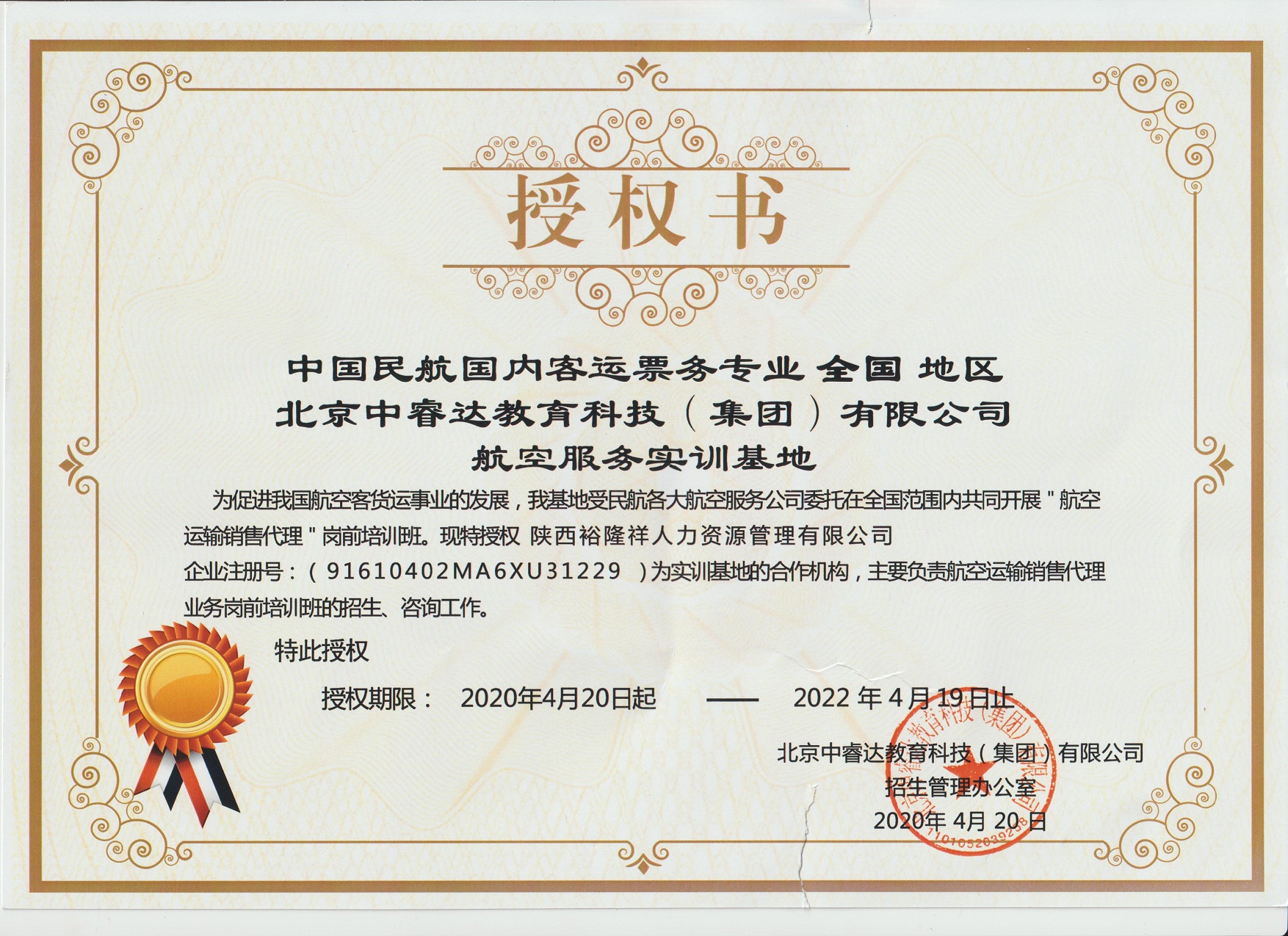 當前位置: 陜西裕隆祥人力資源管理有限公司 > 企業(yè)文化 > 授權單位 > 中國民航國內客運票務專業(yè)全國地區(qū)授權書